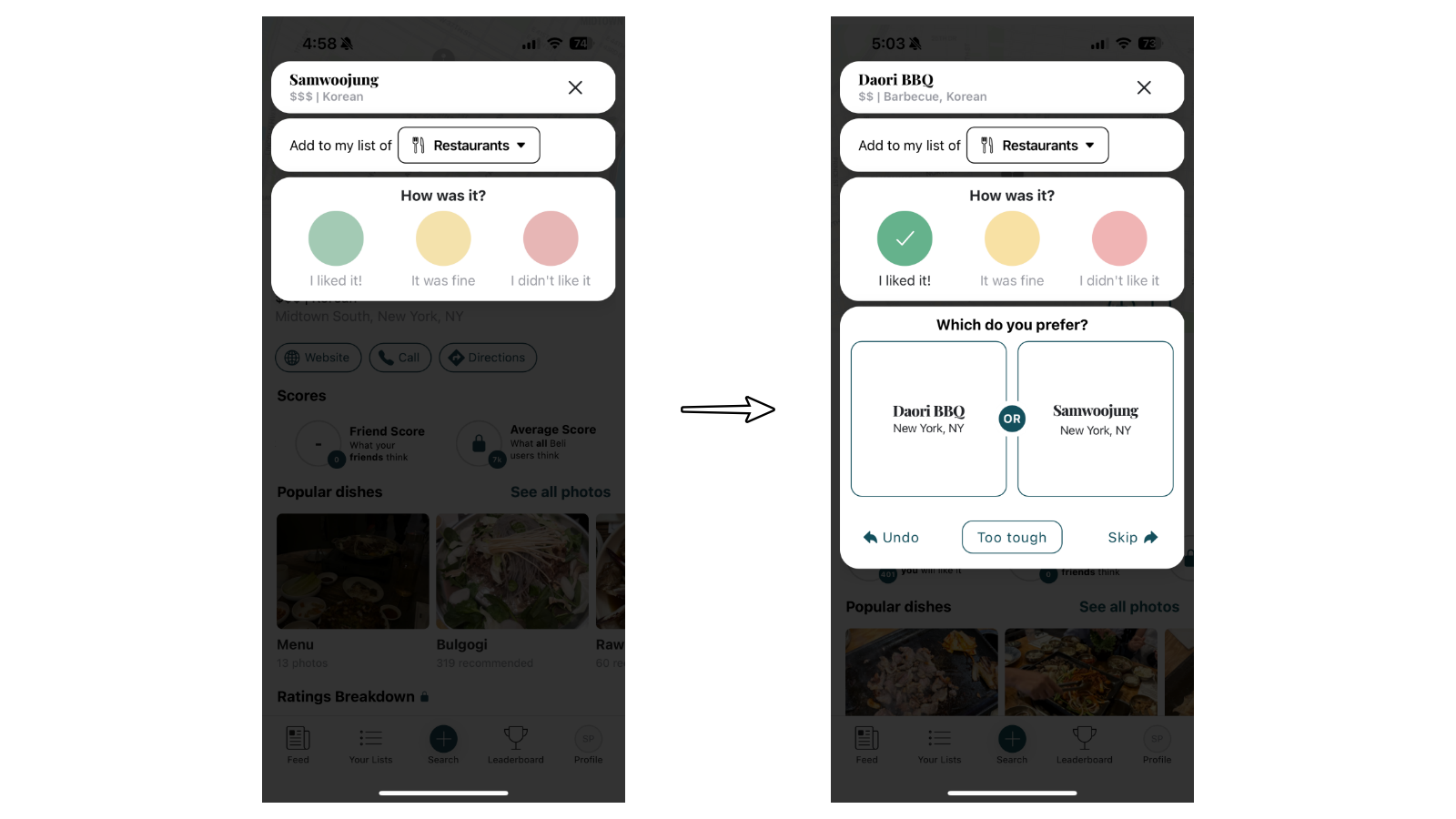 벨리의 사용자들은 자신의 리뷰 활동이 자기 자신에게 도움이 되기 때문에 리뷰를 남깁니다. 벨리 앱에서 사용자는 식당 방문 후 평점이 아닌 호감도로 평가를 남깁니다. '좋았어요', '나쁘지 않았어요', '별로였어요'라는 세 가지 선택지 중 하나를 선택하죠. 이후 최근 방문한 2곳의 레스토랑 중 더 취향에 맞는 곳이 어디인지 묻는 질문에 답하면 평가는 끝납니다.