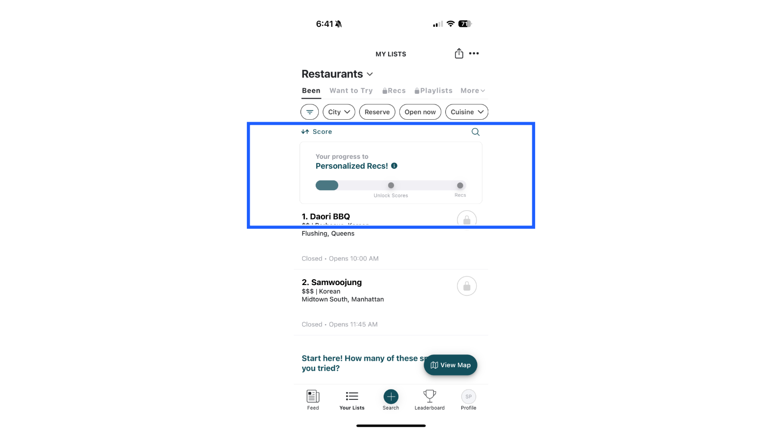 '내 리스트' 탭의 상단에는 사용자가 식당을 평가할 때마다 채워지는 막대 바 모양의 그래프가 자리 잡고 있습니다. 채워지지 않은 막대바는 사람들의 의욕을 자극합니다. 이 간단한 장치로 벨리는 초기 사용자를 충성 사용자로 만드는 선순환 구조를 만듭니다.
